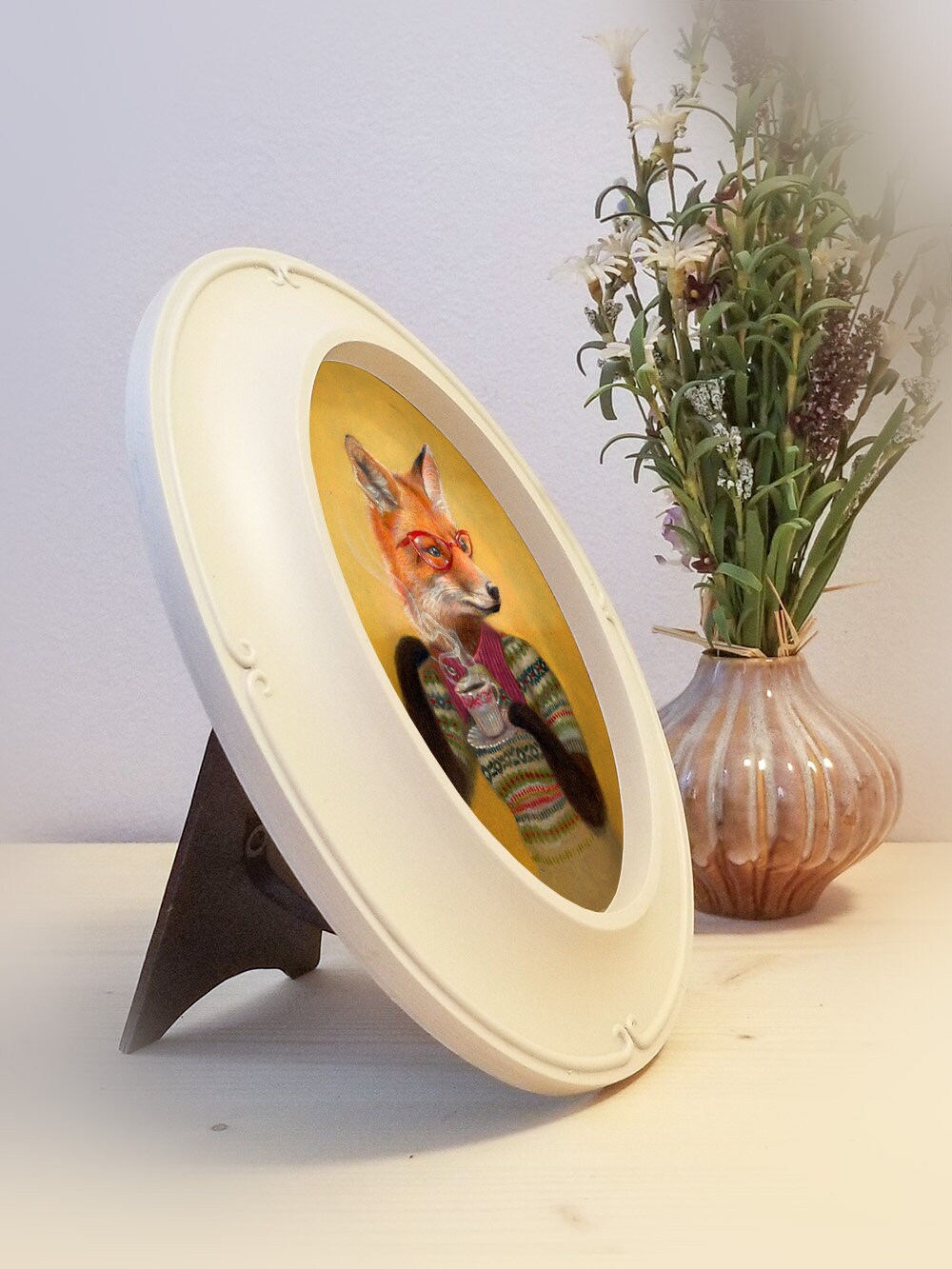 This mounted print of a fox is in an oval frame and hand-varnishing, mimicking the look of an original painting. It is ready to hang or stand.