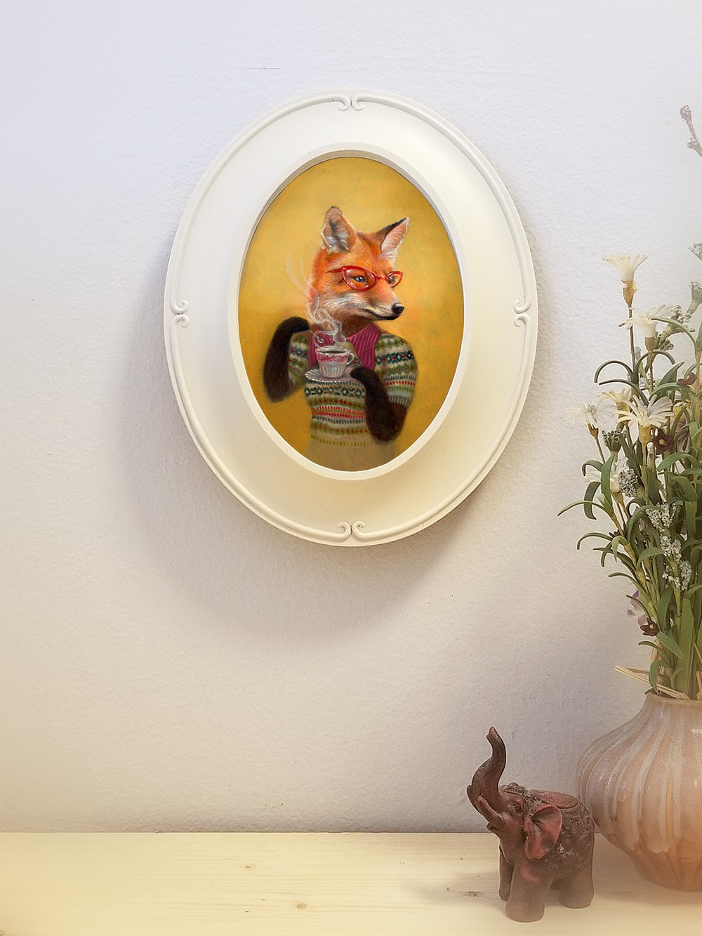 “Agatha” by Erika Taguchi-Newton, is an acrylic painting of a fox with glasses in a fair isle sweater holding a cup of tea.