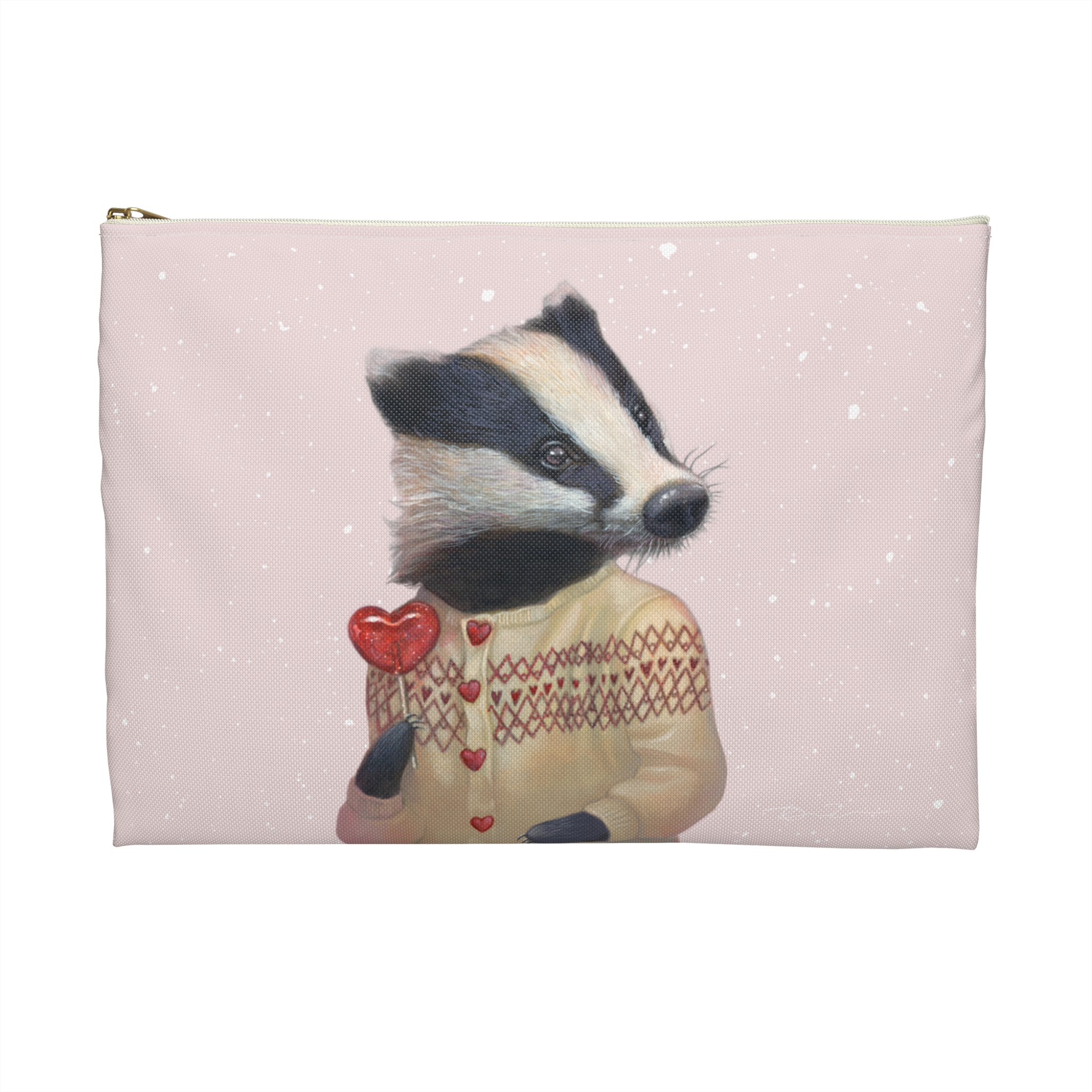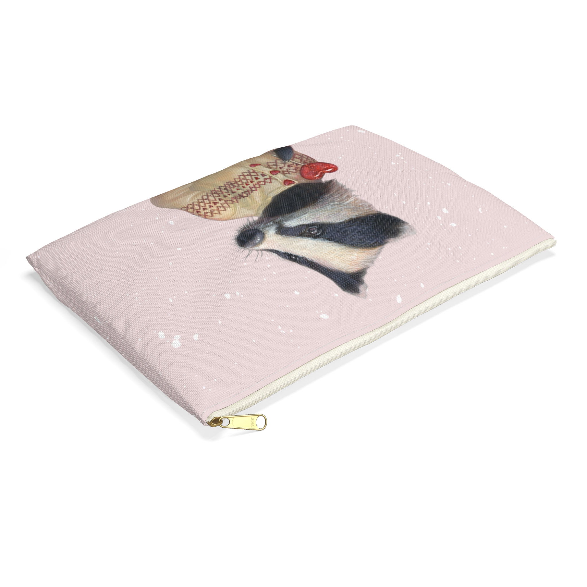 Badger pencil case pouch, animal in fair isle sweater portrait accessory or cosmetic bag, art by Erika Taguchi