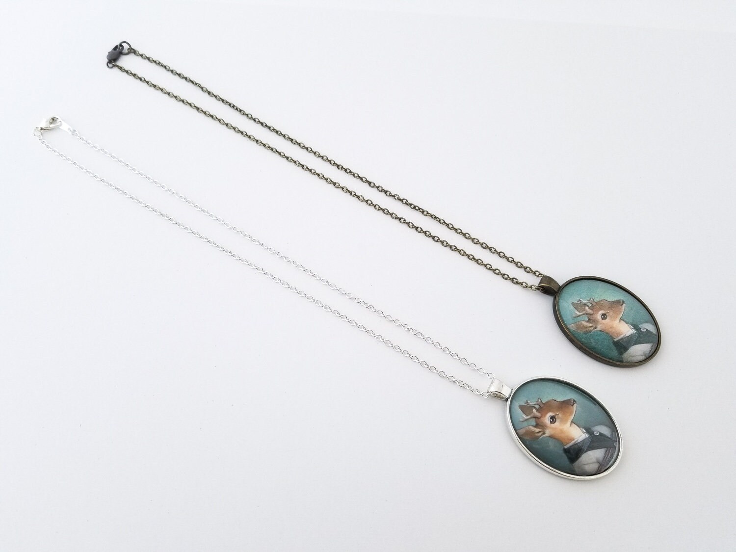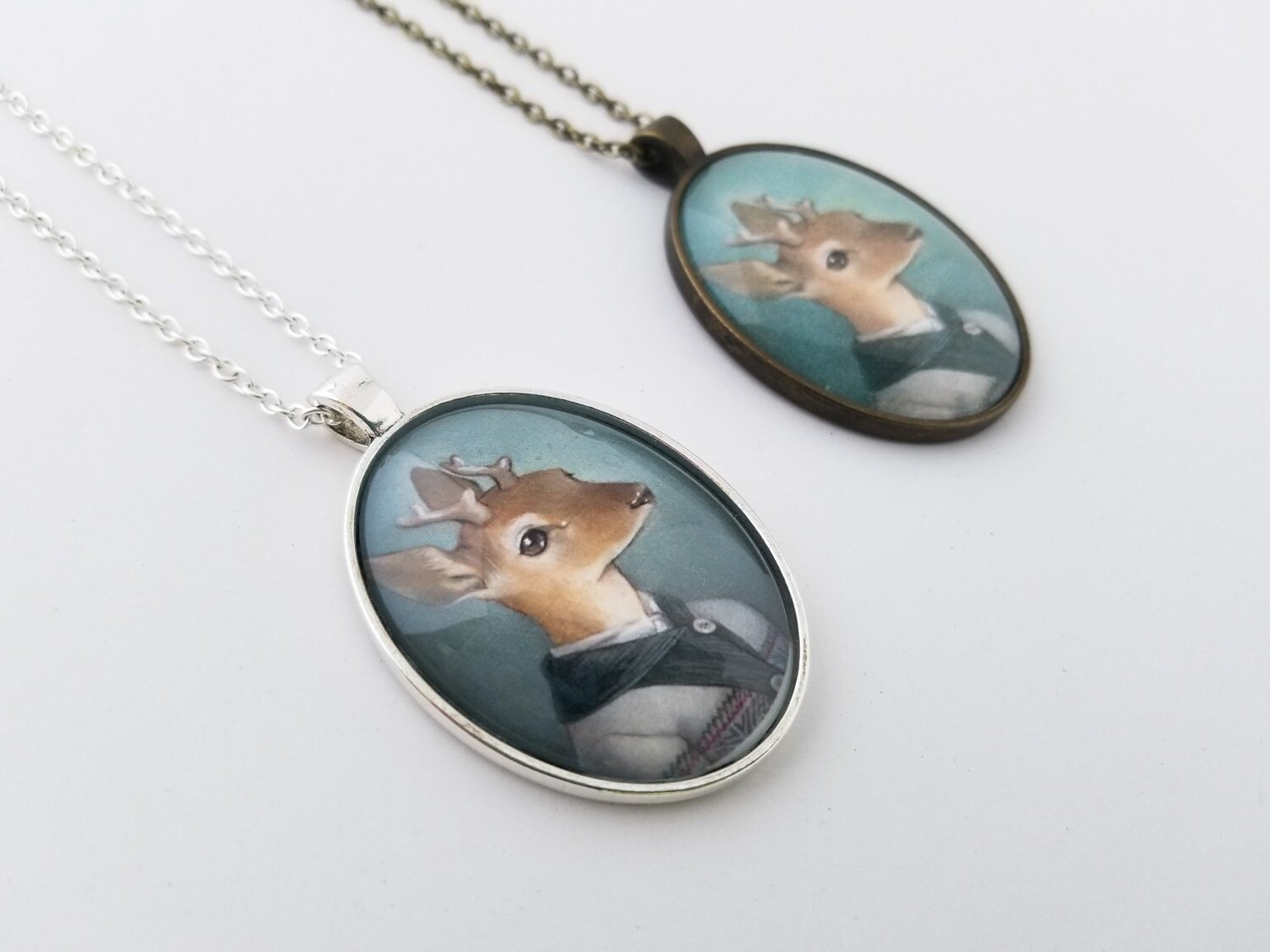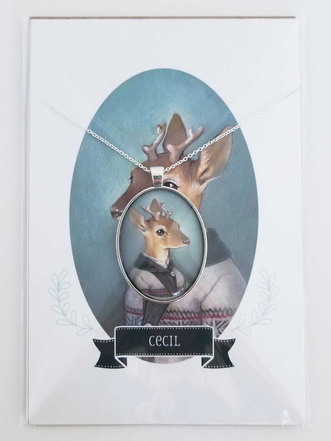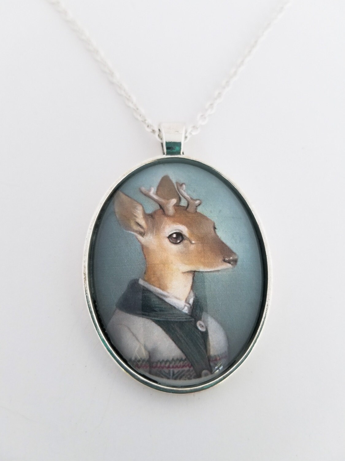 This large oval glass cameo pendant is of a miniature print of a deer in Fair Isle sweater painting – "Cecil" It is available in "Silver" or "Vintage Gold" metal tray and comes with a chain of matching color.