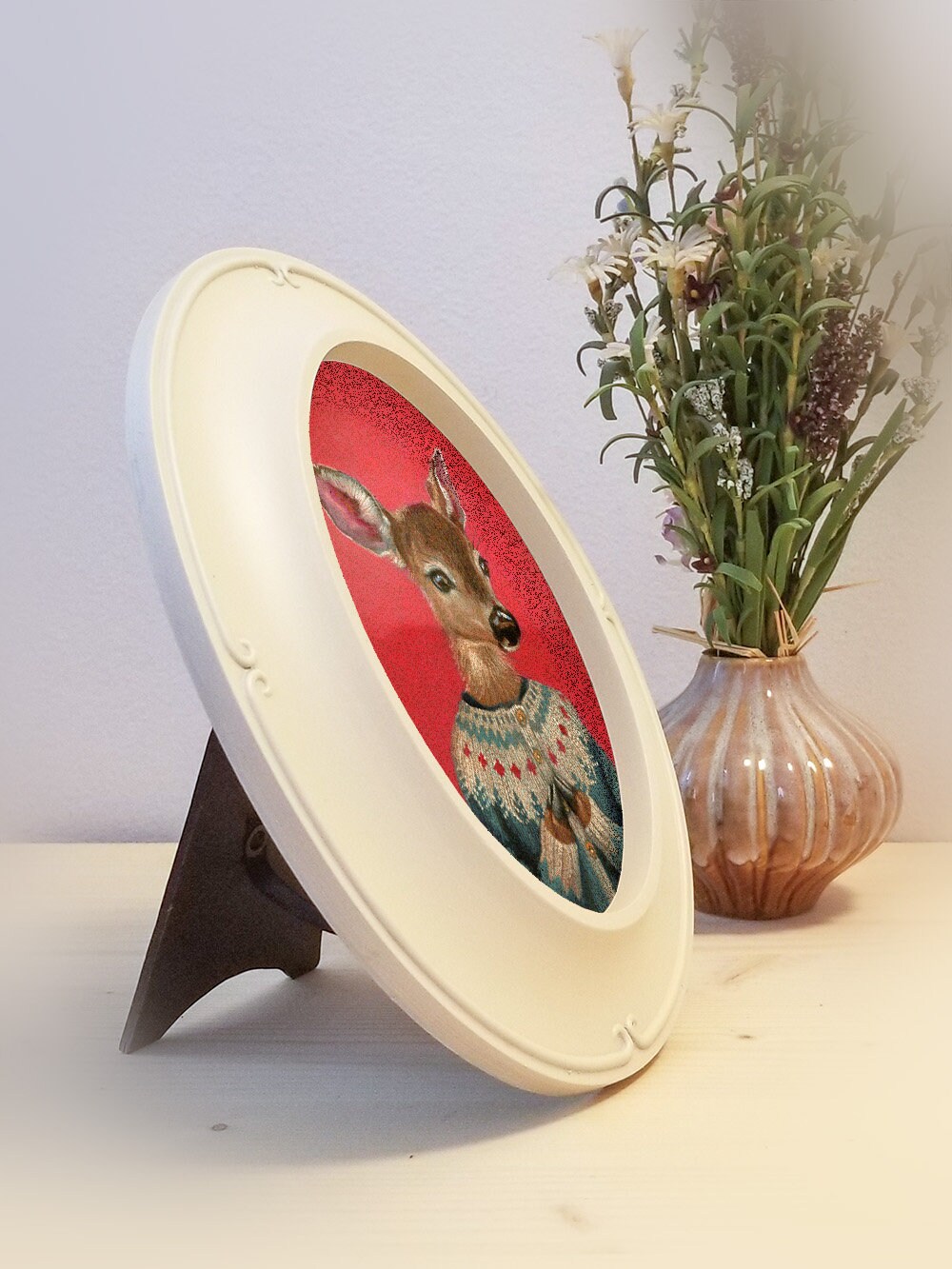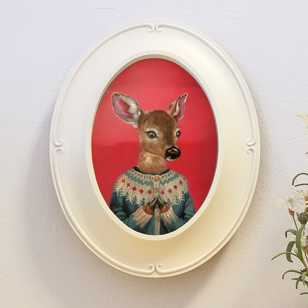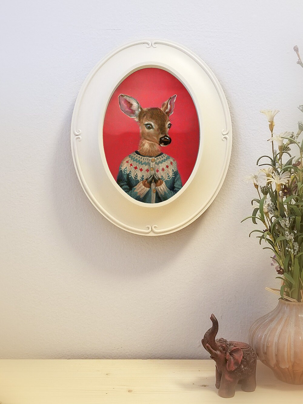 This mounted print of a deer / fawn is in an oval frame and hand-varnishing, mimicking the look of an original painting. It is ready to hang or stand.