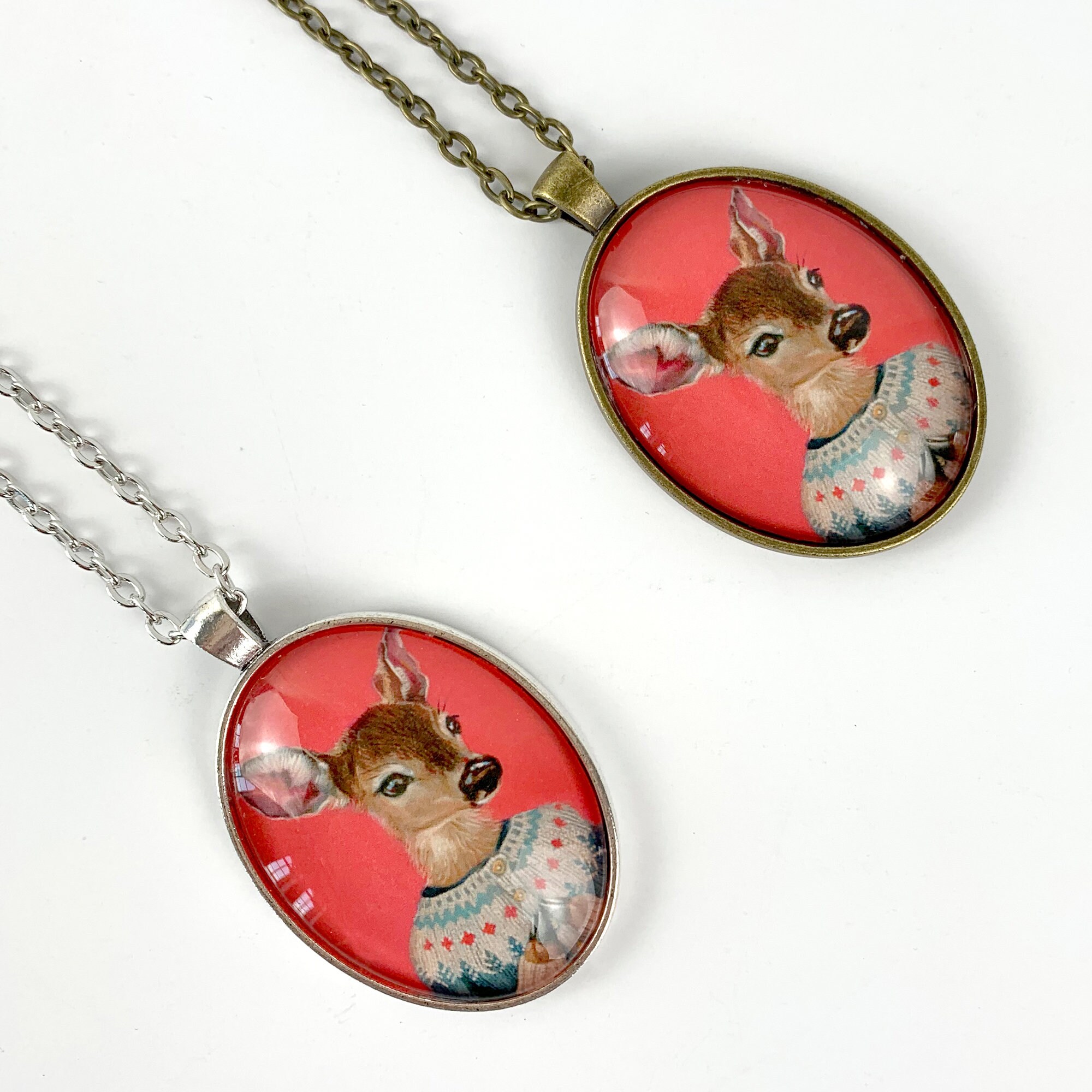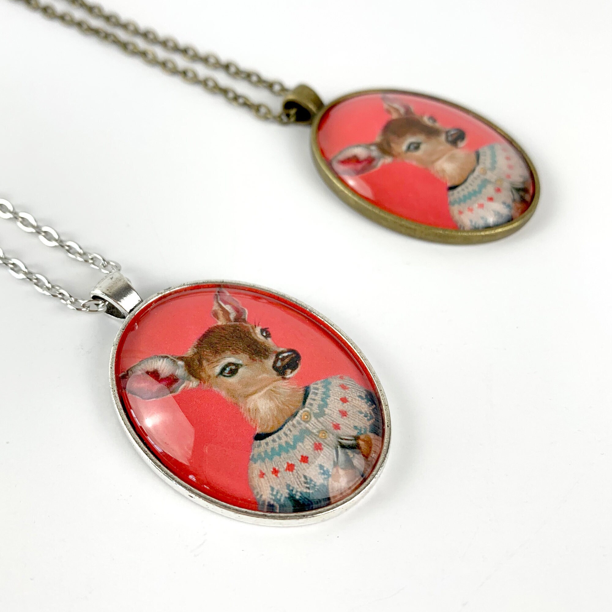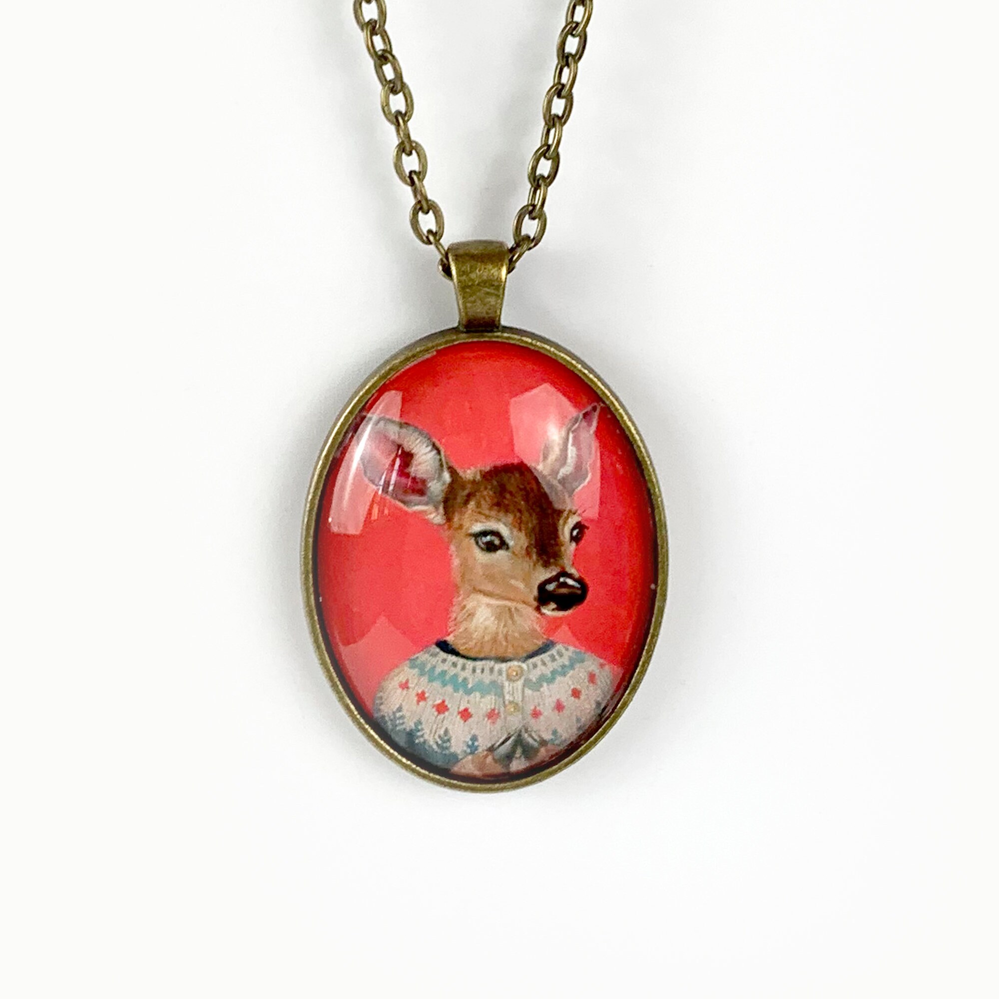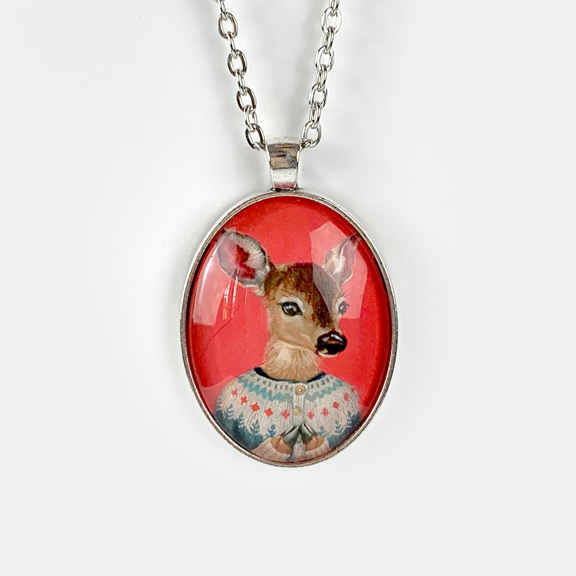 This large oval glass cameo pendant is of a miniature print of a deer in Fair Isle sweater painting – "Elsa" It is available in "Silver" or "Vintage Gold" metal tray and comes with a chain of matching color.