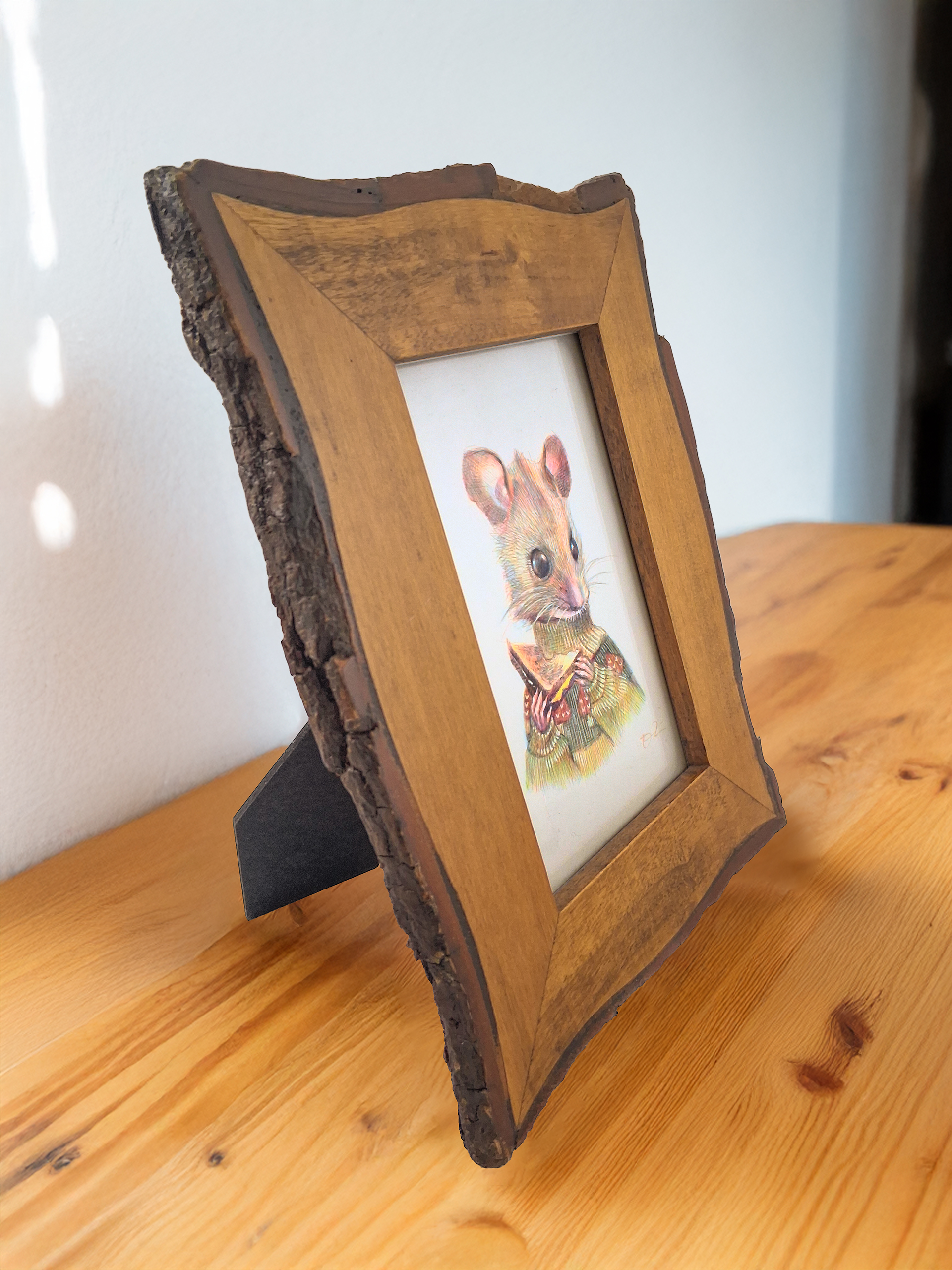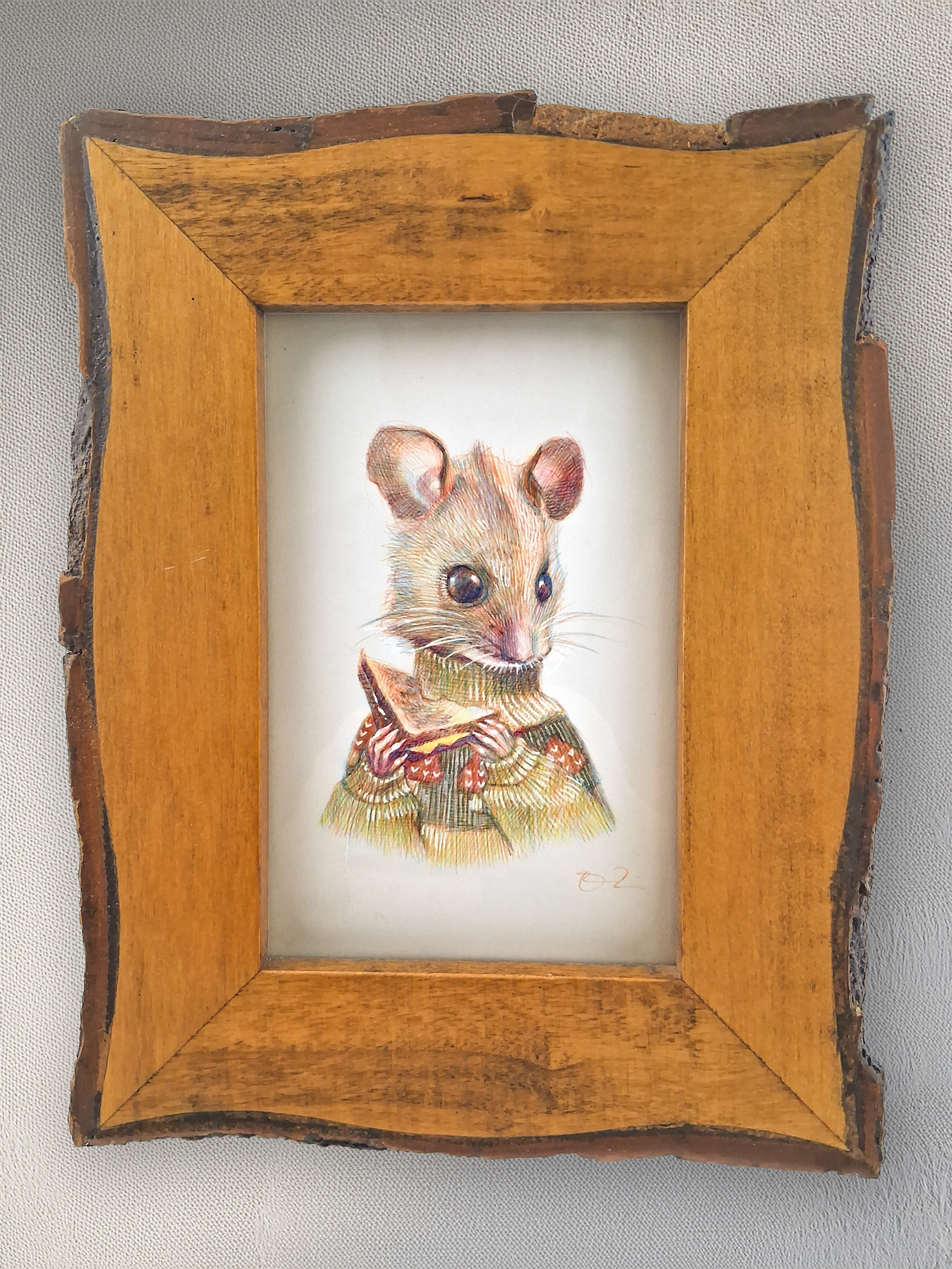 “Flynn”, a 4×6 ballpoint pen drawing, is of a field mouse wearing a mushroom sweater, eating a grilled cheese sandwich.