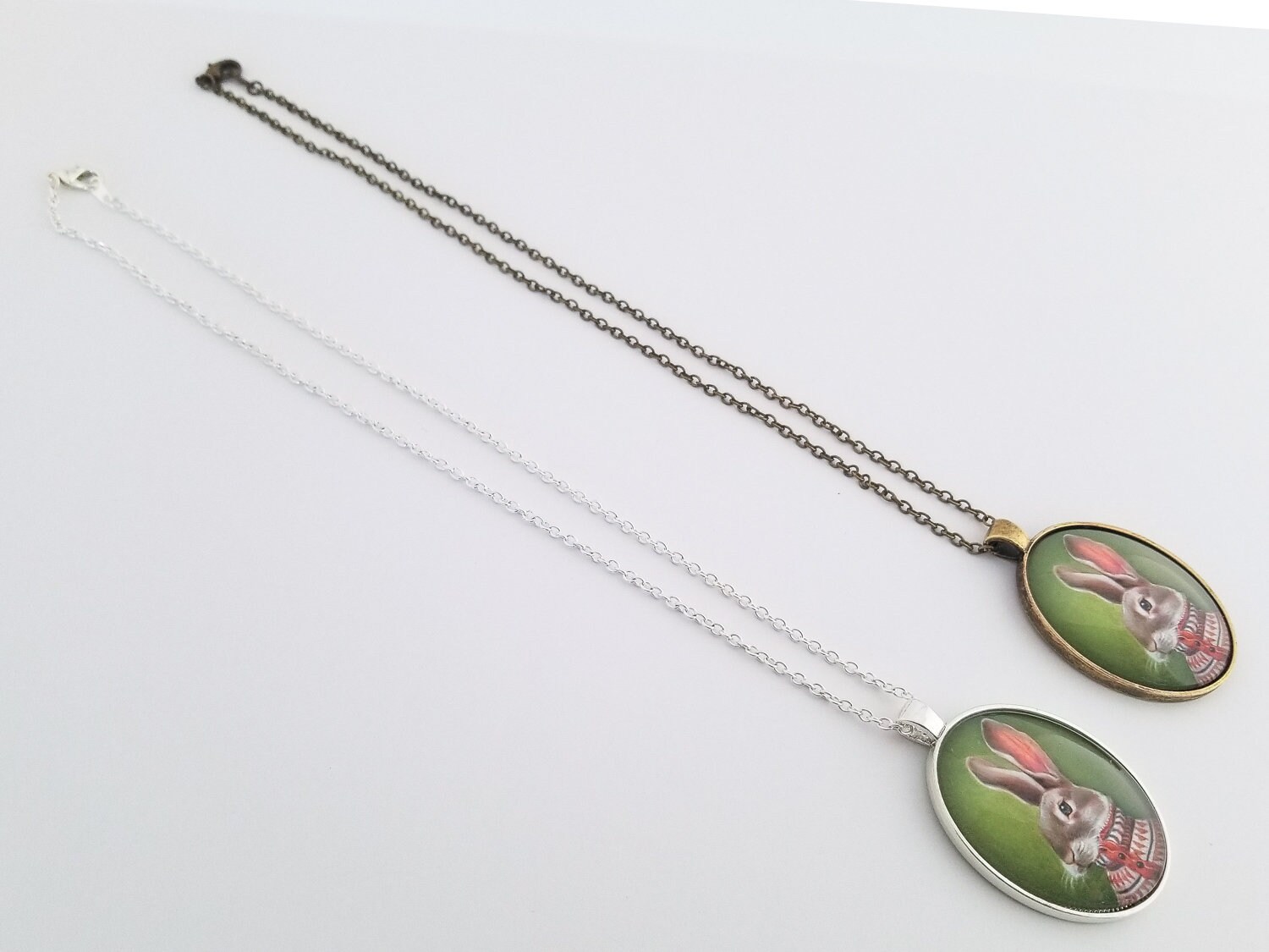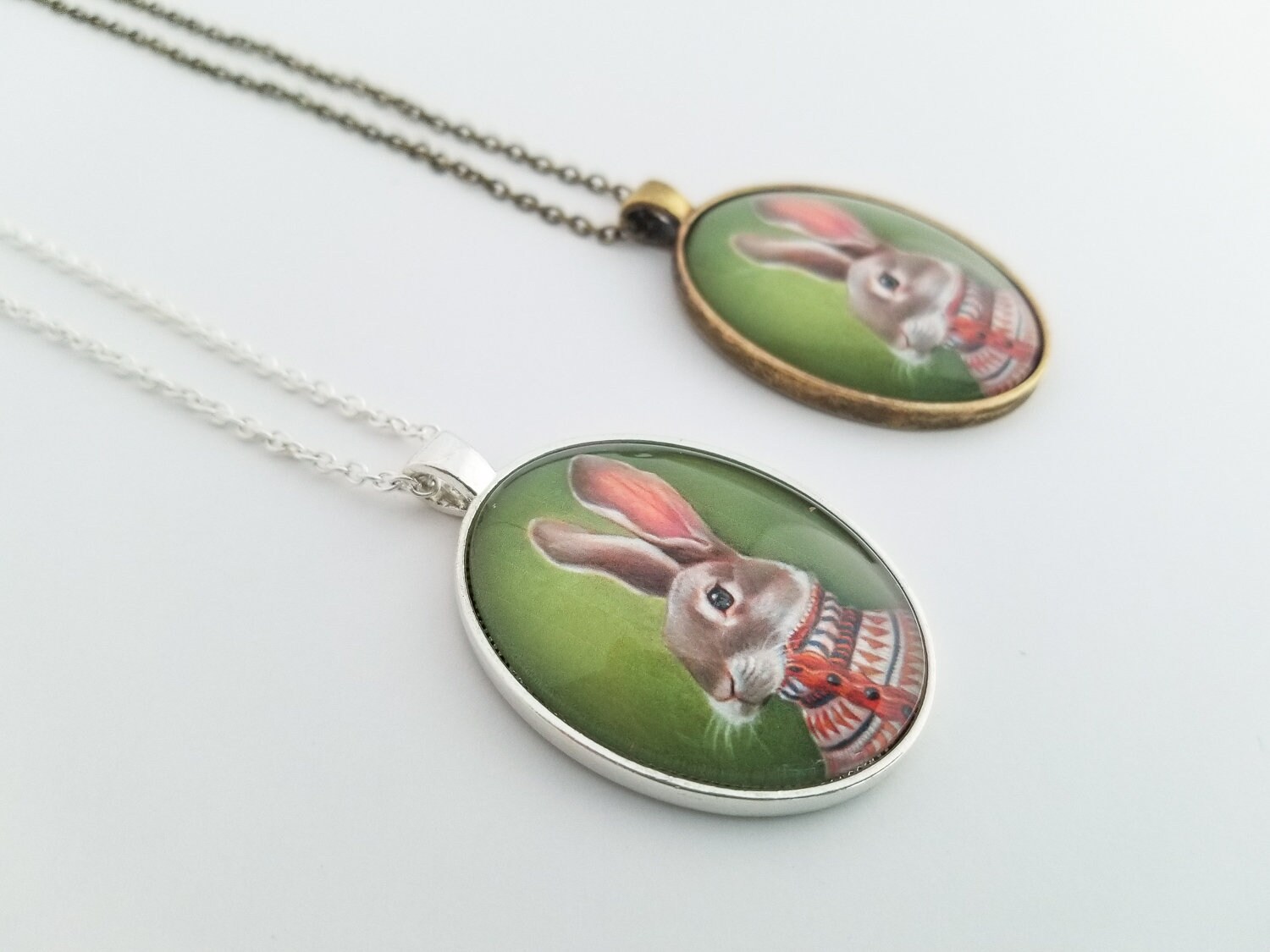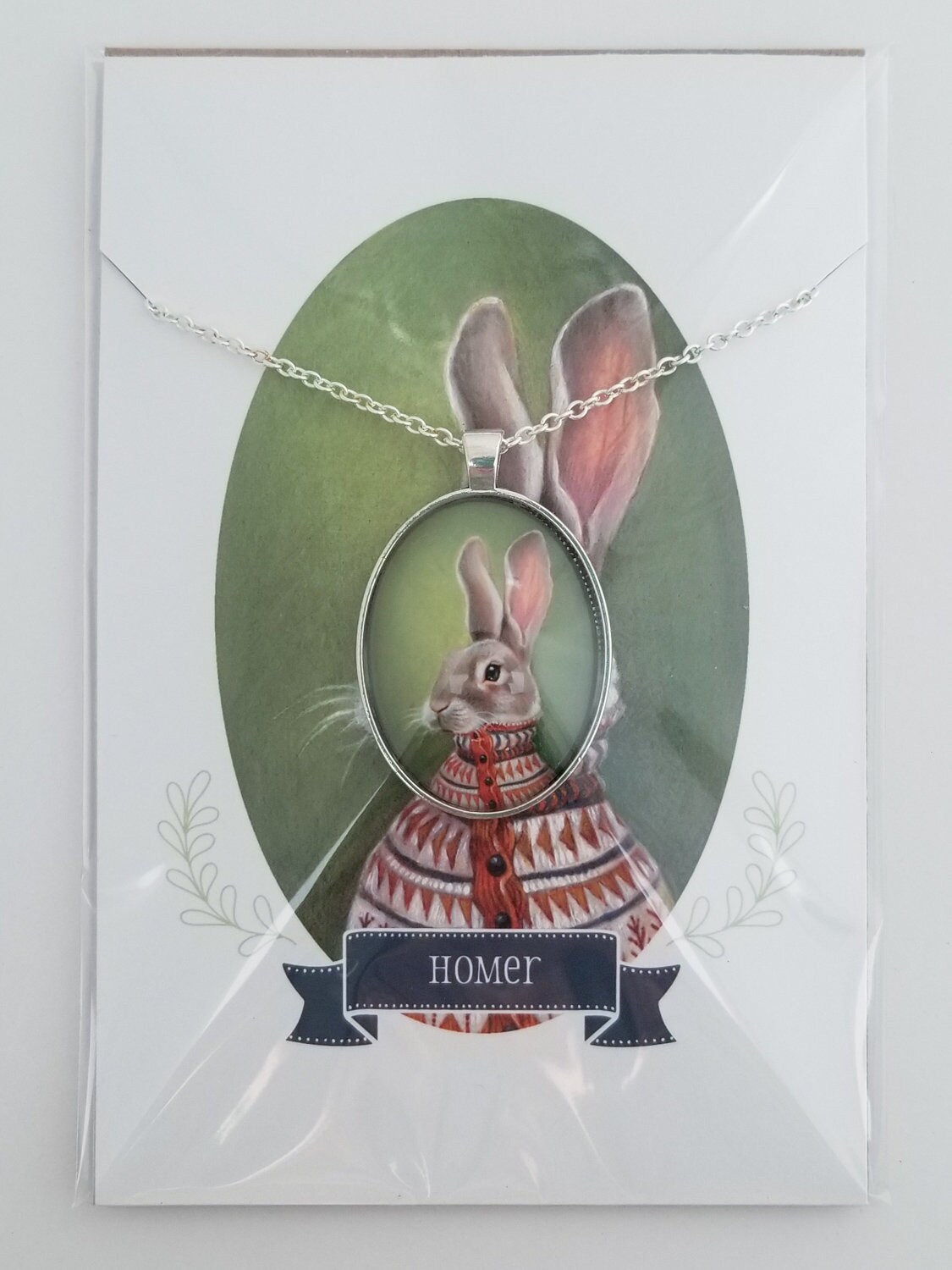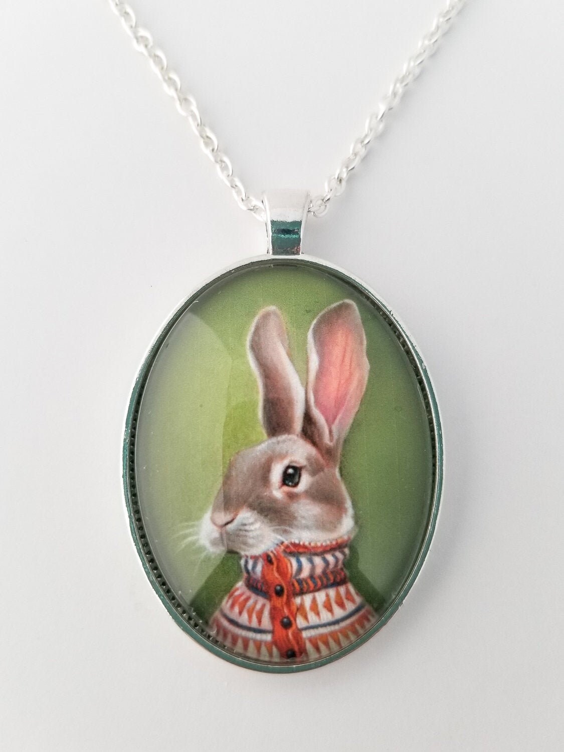This large oval glass cameo pendant is of a miniature print of a rabbit painting – "Homer" It is available in "Silver" or "Vintage Gold" metal tray and comes with a chain of matching color.