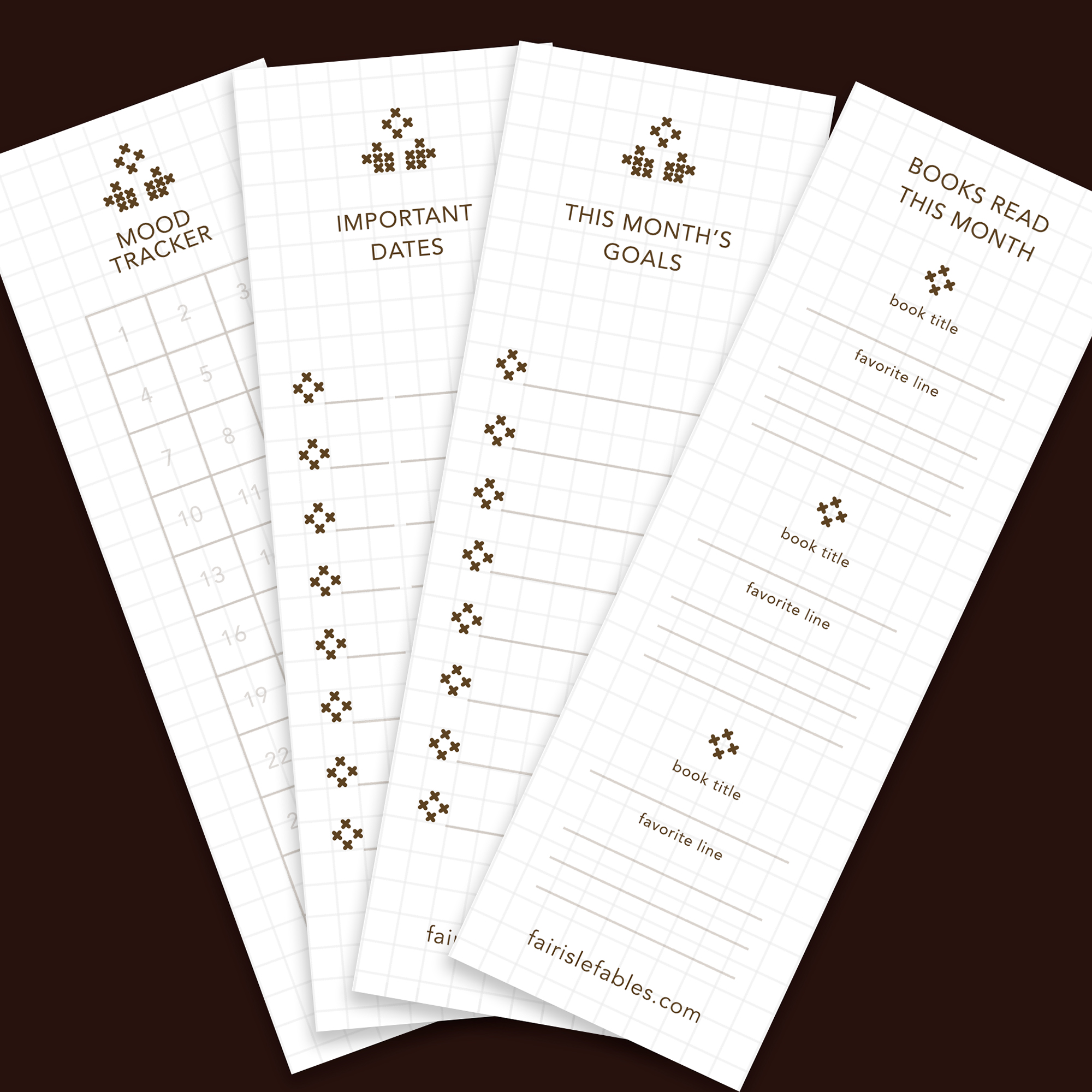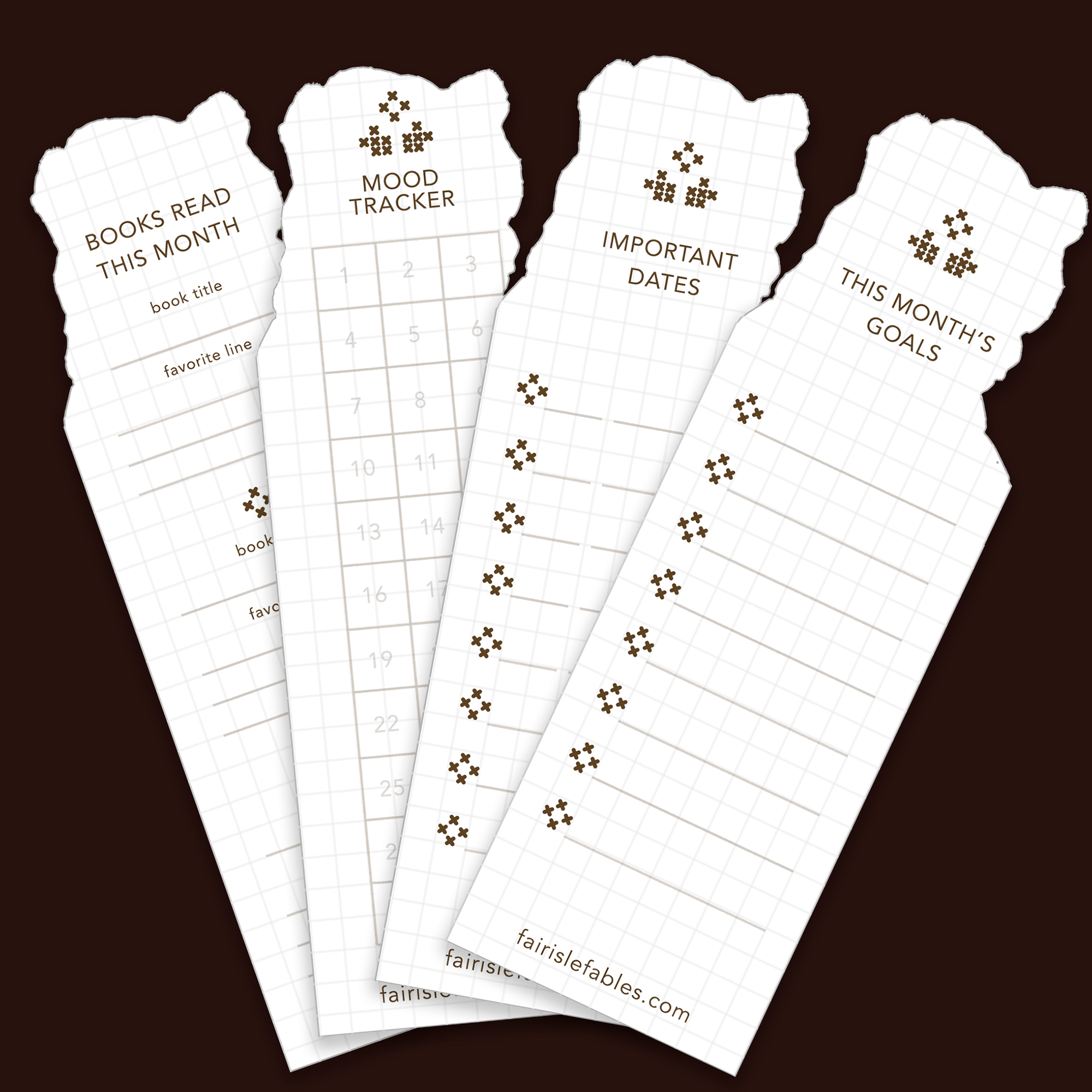 This month’s design features Sawyer in his signature Fair Isle sweater on the front with a handy calendar. Choose from 4 different tracker options on the back to customize your bookmark to fit your needs!