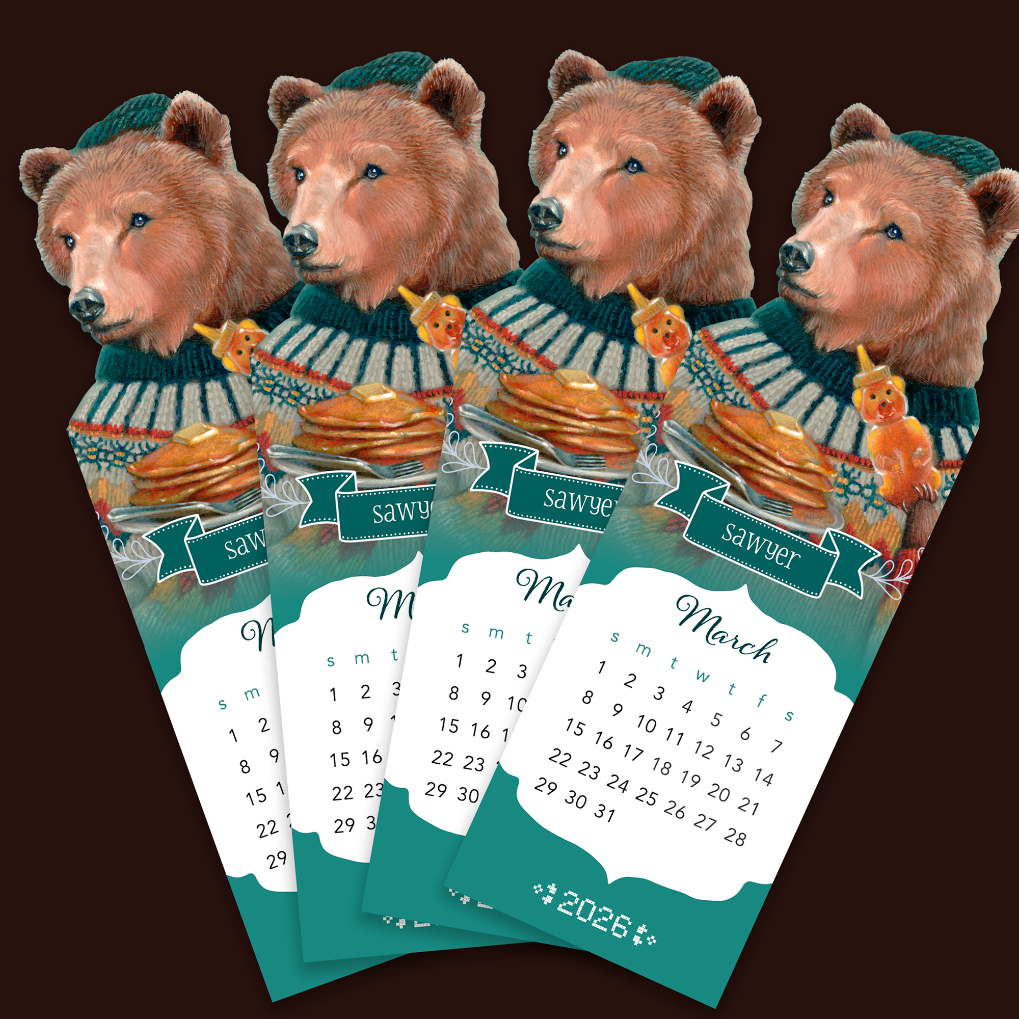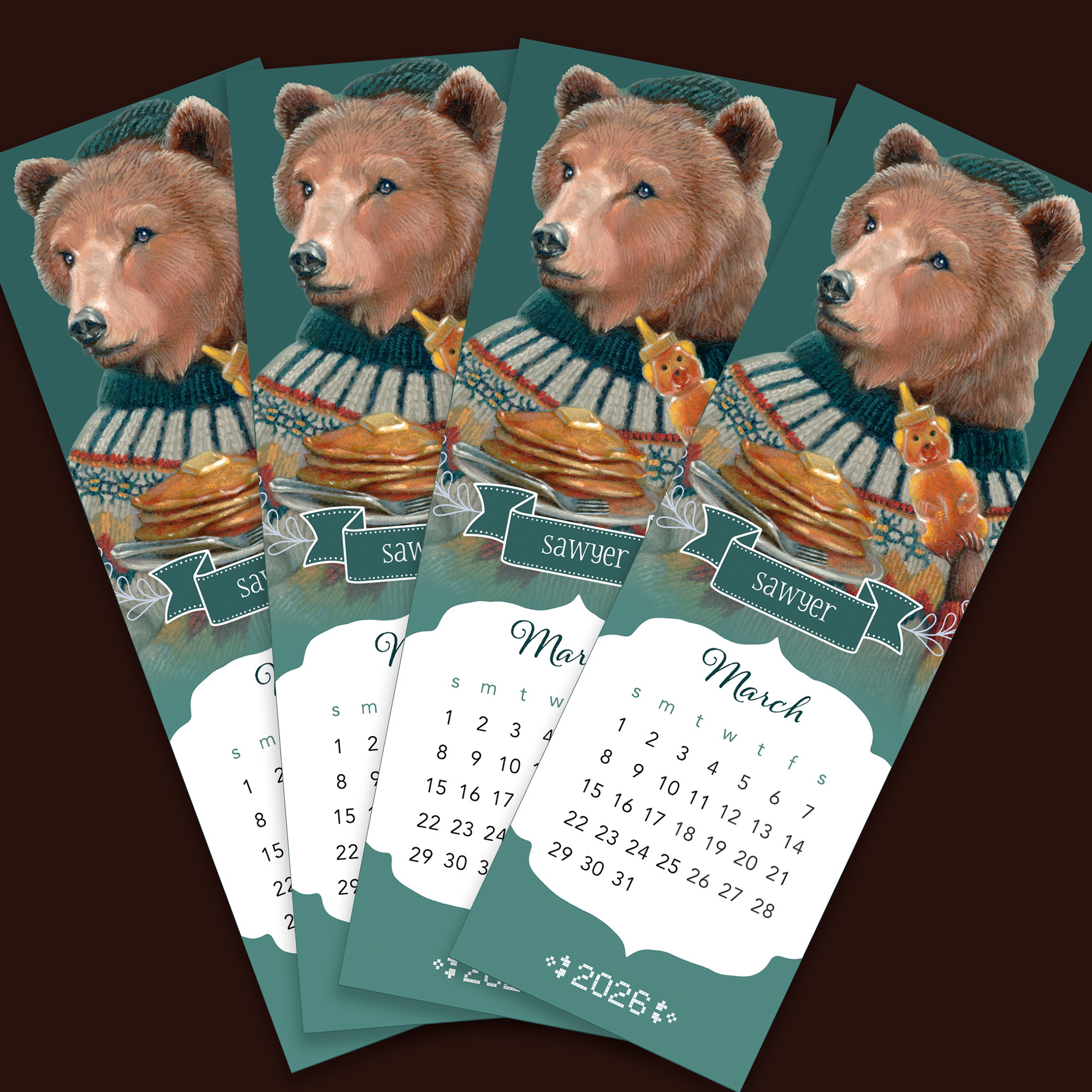 Keep track of March in whimsical style with this printable bookmark calendar featuring Sawyer, the Honey Bear from Fair Isle Fables. Perfect for book lovers and planners alike, this 2×6 inch digital download combines functionality with enchanting artwork by Erika Taguchi.