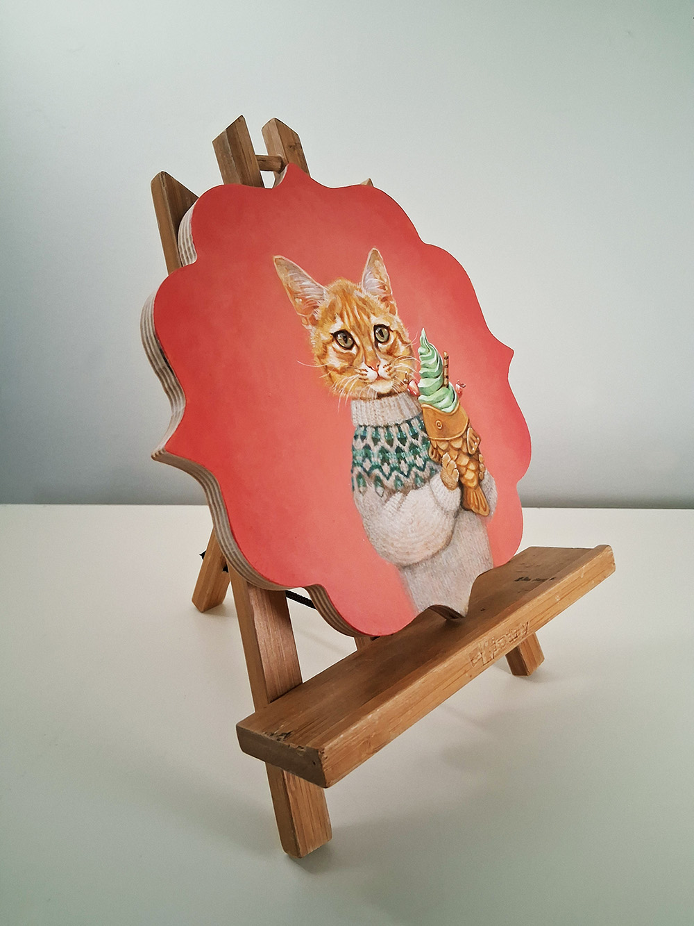 “Sophie”, an acrylic painting on 8×8 Trekell panel, is of an orange cat wearing a sweater, holding soft-serve ice cream in a taiyaki-shaped cone.
