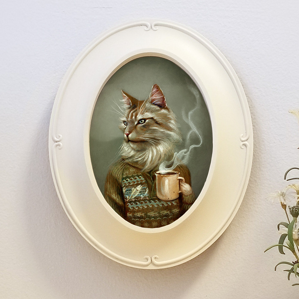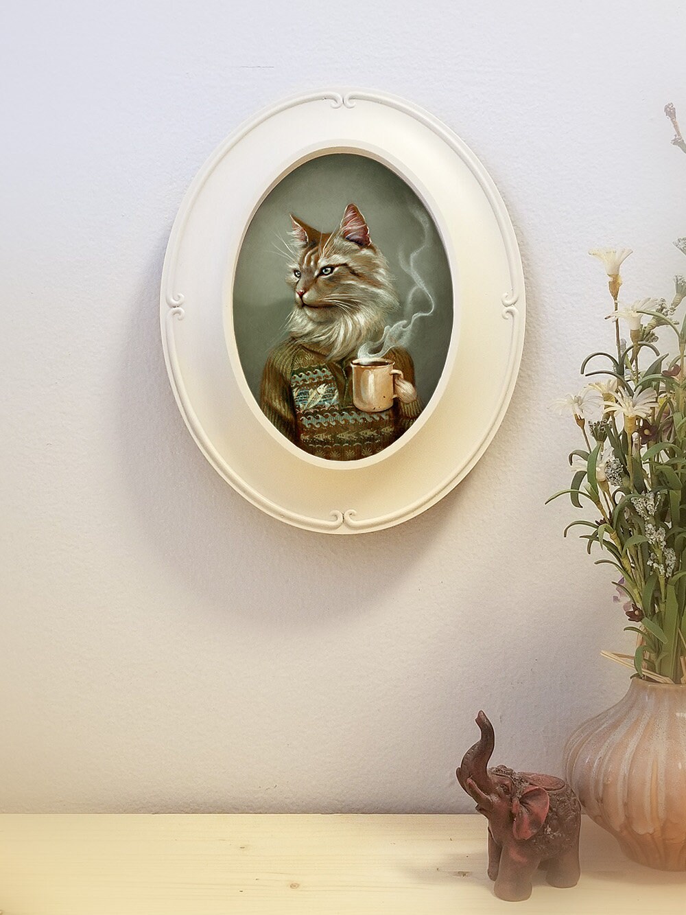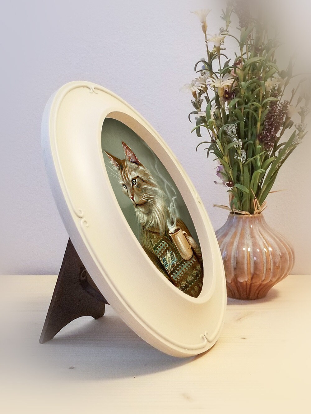 This mounted print of a Maine coon cat is in an oval frame and hand-varnishing, mimicking the look of an original painting. It is ready to hang or stand.