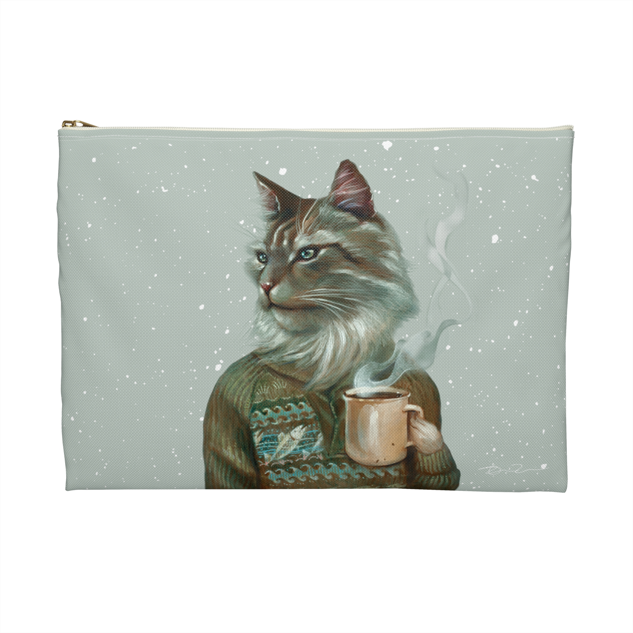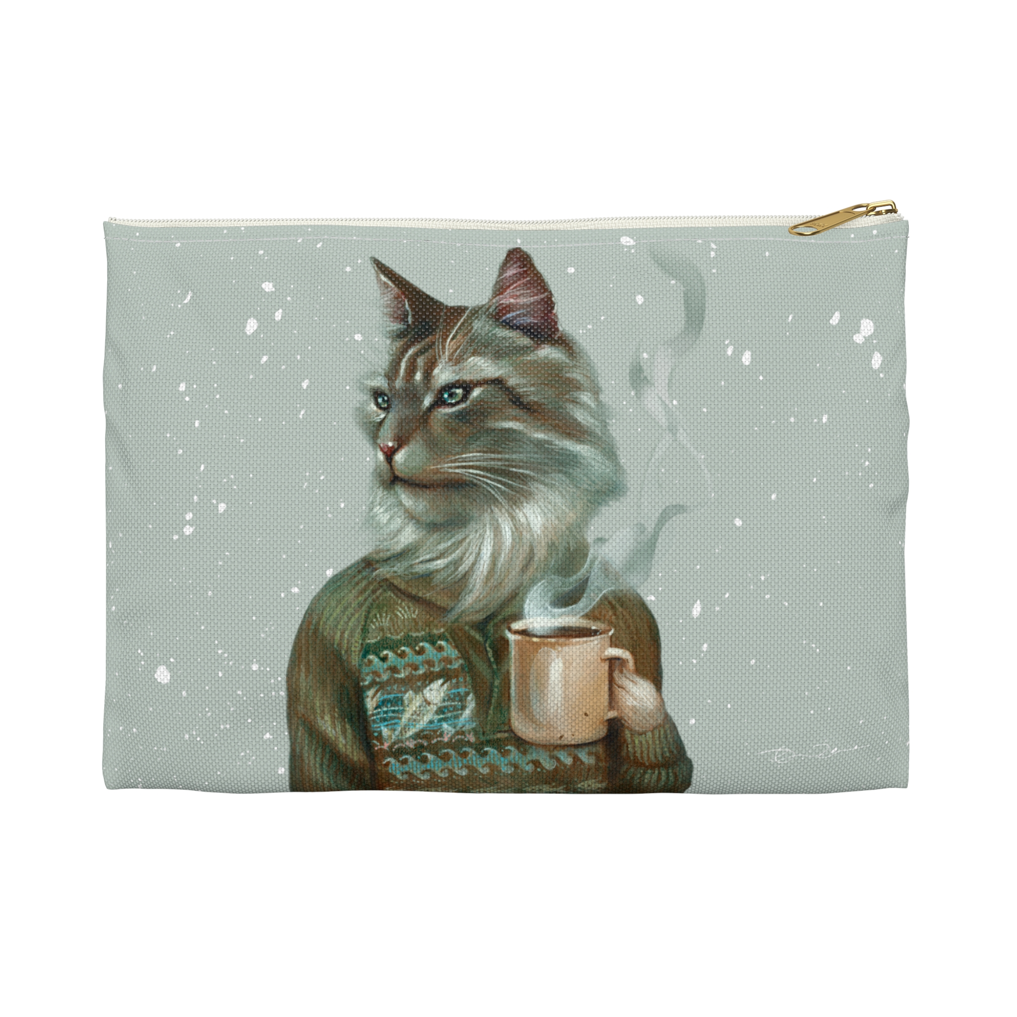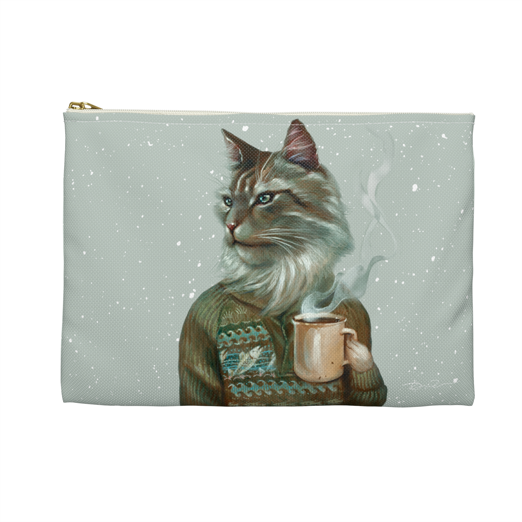 Cat with coffee pencil case pouch, animal in fair isle sweater portrait accessory or cosmetic bag, art by Erika Taguchi-Newton – “Tigerius”