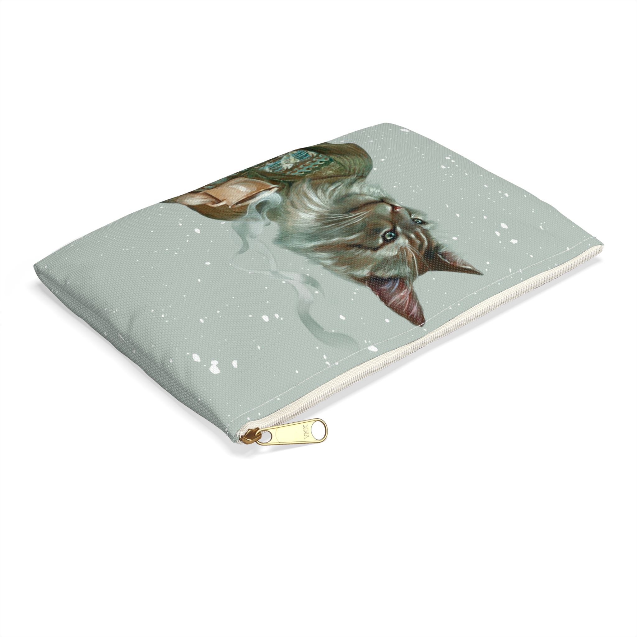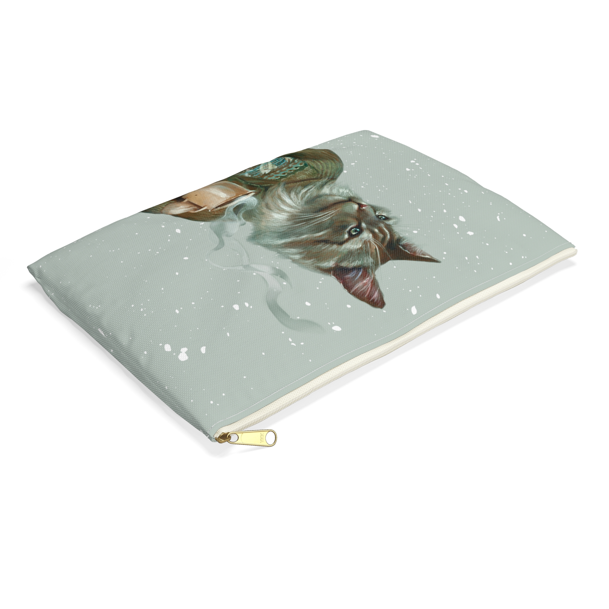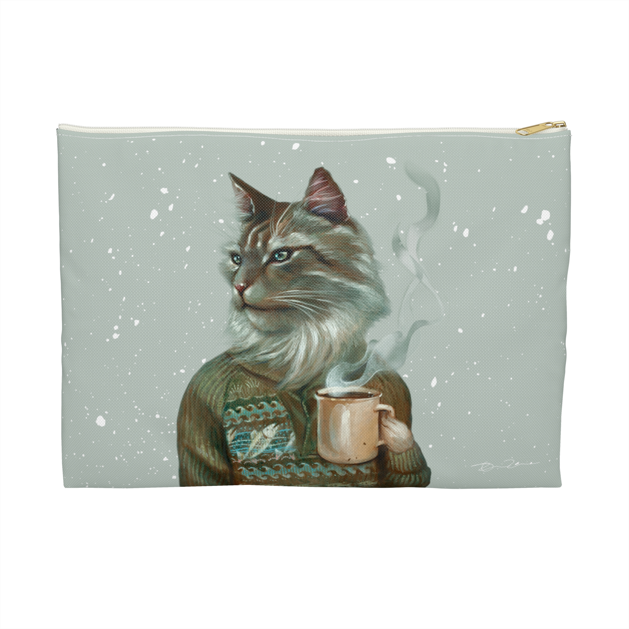 Cat with coffee pencil case pouch, animal in fair isle sweater portrait accessory or cosmetic bag, art by Erika Taguchi-Newton – “Tigerius”
