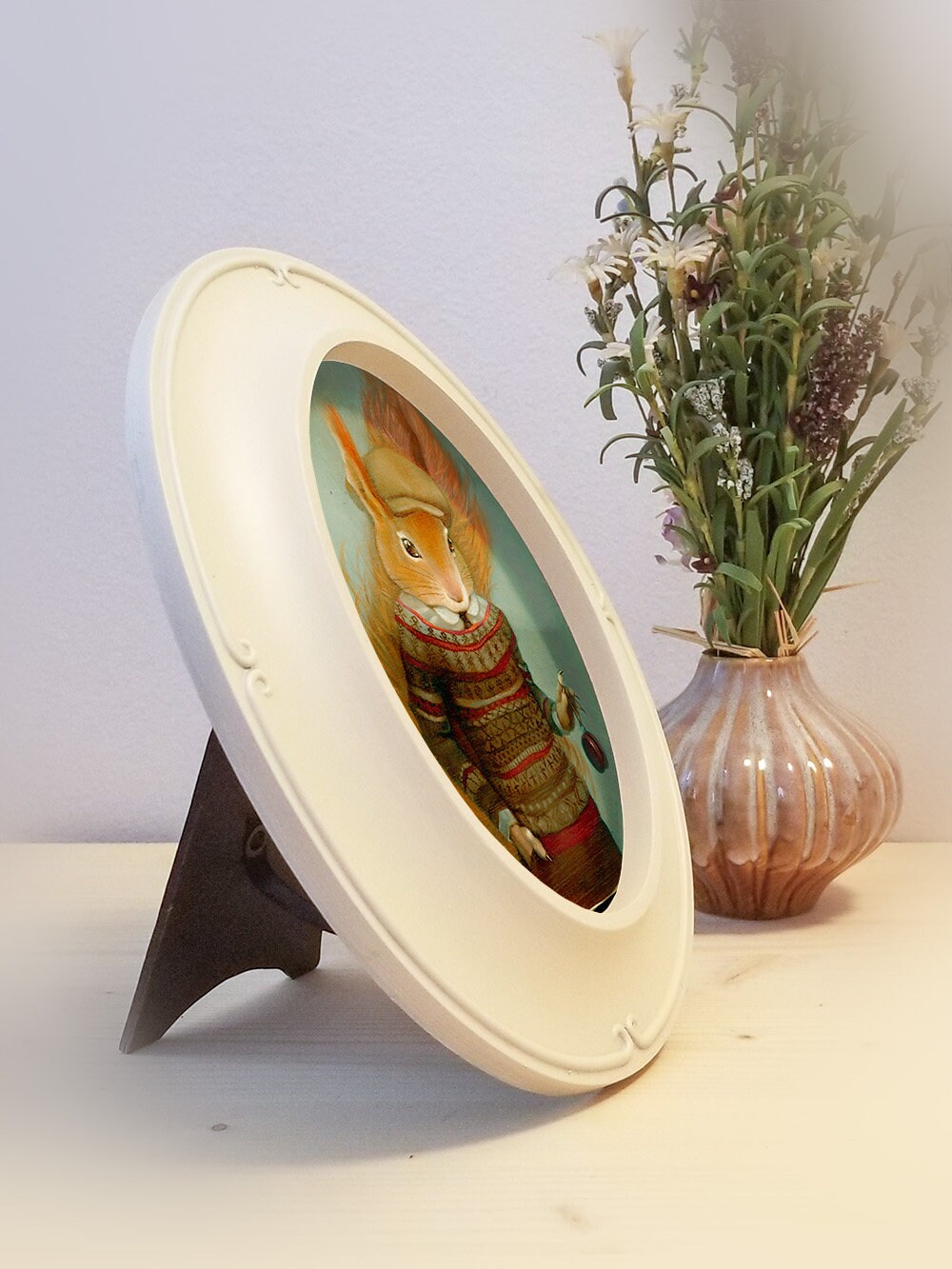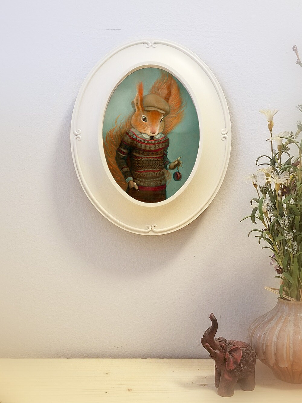 This mounted print of a squirrel is in an oval frame and hand-varnishing, mimicking the look of an original painting. It is ready to hang or stand.